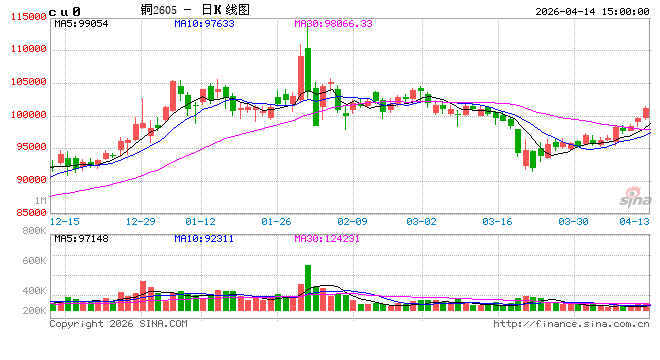 4月14日铜期货市场动态:今日沪期铜高开暴走,盘中运行态势强势;主力月2605合约开盘价报99760元/吨,最高101450元/吨,最低99520元/吨,昨结99160元/吨,今日收盘价报101190元/吨,涨2030元,涨幅2.05%。沪铜主力2605合约全天成交量112521手增加1467手,持仓量168152手减少3525手。亚盘时段,伦铜探底回升,北京时间15:08最新报价13196美元/吨,涨72.5美元/吨,涨幅0.55%。