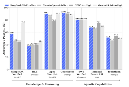 2026年4月24日,期待已久的DeepSeekV4终于落地。从性能上看,DeepSeek-V4-Pro亮点颇多。首先,Agent 能力显著增强,在Agentic Coding 评测中,V4-Pro 已达到当前开源模型最佳水平,并在其他 Agent 相关评测中同样表现优异。其次,世界知识方面,DeepSeek-V4-Pro 在世界知识测评中,大幅领先其他开源模型,仅稍逊于顶尖闭源模型 Gemini-Pro-3.1。世界顶级推理性能:在数学、STEM、竞赛型代码的测评中,DeepSeek-V4-Pro 超越当前所有已公开评测的开源模型,取得了比肩世界顶级闭源模型的优异成绩。