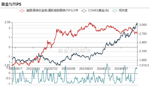 从滚动相关性的角度来看,黄金与美元指数的相关性走低,和铜、原油的相关性走高。