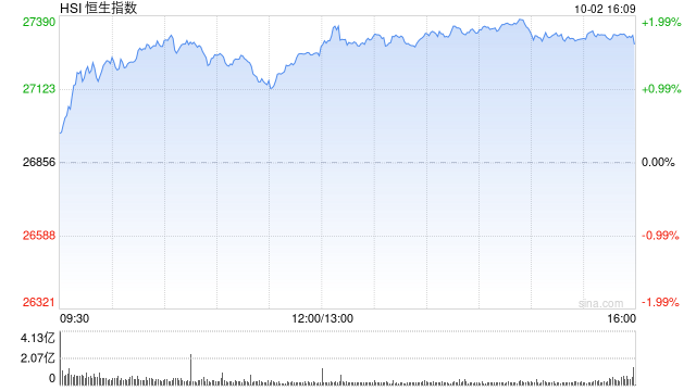 10月2日消息,港股三大指数高开高走。截至午间收盘,恒生指数涨1.45%,报27245.68点,恒生科技指数涨2.66%,国企指数涨1.63%。盘面上,科网股普涨,快手涨超6%,百度涨超4%,阿里巴巴涨超3%,京东、美团、小米、腾讯涨超2%,联想、网易涨超1%;半导体板块强势,中芯国际涨超9%;黄金股普涨,中国白银集团涨超32%,紫金黄金国际涨超12%;苹果概念涨幅居前,鸿腾精密涨超12%;锂电池板块走强,宁德时代涨超4%;创新药概念延续涨势,恒瑞医药涨超5%。