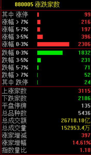 全市场共3115只个股上涨,99只个股涨停,2186只个股下跌。