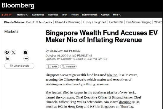 正文 蔚来港股跌幅一度扩大至13%,美股夜盘大跌超10%,新加坡政府投资公司指控蔚来收入虚增 金鑫科技 V管理员 /今天/5阅读/0评论 1016 文章最后更新时间2025年10月16日,若文章内容或图片失效,请留言反馈! 蔚来港股跌幅一度扩大至13%,蔚来美股夜盘大跌超10%。截至发稿,蔚来跌超10%,报价48.76港元,成交额逾9亿港元。 消息面上,据彭博报道称新加坡政府投资公司(GIC)指控蔚来收入虚增。