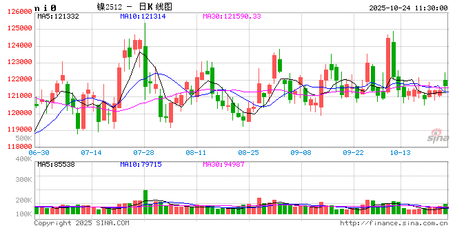 镍期货市场:美联储降息预期全面升温流动性宽裕,隔夜伦镍收涨1.29%;伦镍最新收盘报15335,成交7337手,国内方面,夜盘沪期镍高位窄幅震荡,尾盘小幅收涨,沪镍主力合约2512最新收报122140元/吨,涨970元/吨,涨幅为0.8%;