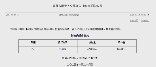 正文 央行公开市场今日净投放3158亿元 金鑫科技 V管理员 /昨天/5阅读/0评论 1028 文章最后更新时间2025年10月28日,若文章内容或图片失效,请留言反馈! 10月28日金融一线消息,央行今日开展4753亿元7天逆回购操作,操作利率为1.40%,与此前持平。因今日有1595亿元7天期逆回购到期,当日实现净投放3158亿元。