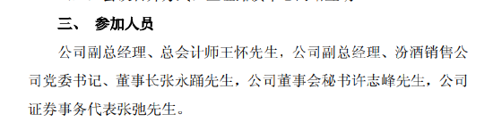 公告显示,出席此次业绩说明会的人员包括汾酒副总经理、总会计师王怀,公司副总经理、汾酒销售公司党委书记、董事长张永踊,公司董事会秘书许志峰,公司证券事务代表张弛。