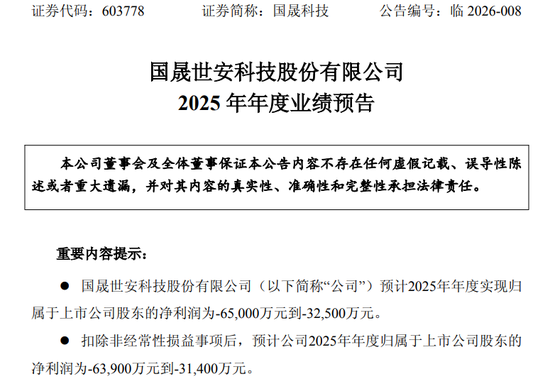 1月20日晚间,国晟科技发布2025年业绩预告,预计2025年净利润亏损3.25亿元至6.50亿元。