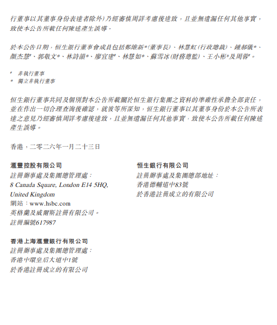 正文 恒生银行:撤销股份上市地位自1月27日下午4时正起生效 金鑫科技 V管理员 /01-23/35阅读/0评论 0123 文章最后更新时间2026年01月23日,若文章内容或图片失效,请留言反馈! 1月23日金融一线消息,恒生银行公告称,私有化计划于2026年1月23日(星期五)举行的法院聆讯中获香港高等法院认许,未作任何修订。股本削减亦于同日在同一聆讯中获高等法院确认。计划预期于2026年1月26日(星期一)变成具约束力且生效。于计划变成具约束力且生效后,将另行刊发公告。恒生银行已向香港联交所申请,而香港联交所已批准撤销恒生银行股份在香港联交所的上市地位,自2026年1月27日(星期二)下午4时正起生效,惟须待计划变成具约束力且生效后方告作实。