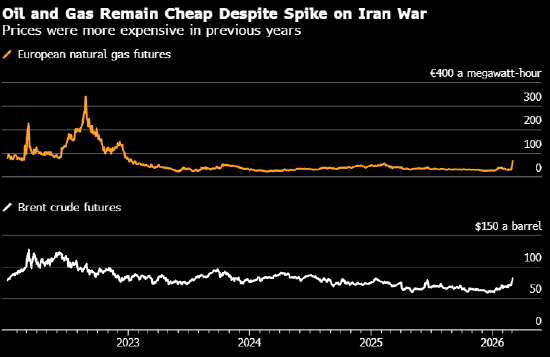 然而,尽管价格飙升,此次波动幅度远小于以往危机。布伦特原油周一虽跳涨,但仅触及2024年以来最高;欧洲天然气价格暴涨39%,与2021-22年能源危机的剧烈波动相比,也几乎算不上什么大动静。
