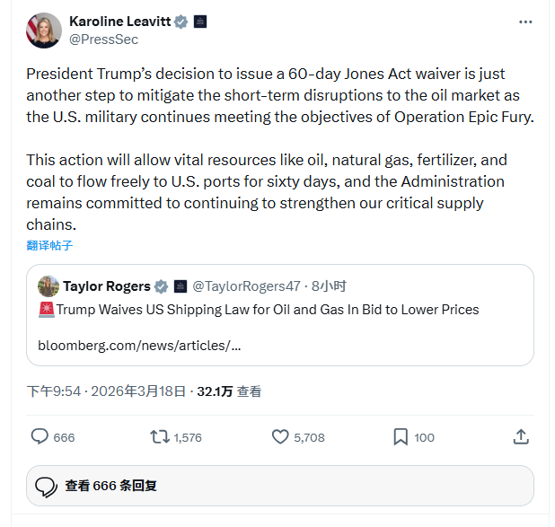 白宫新闻秘书卡罗琳·莱维特在一份声明中表示,暂时豁免《琼斯法案》“将允许石油、天然气、化肥和煤炭等重要资源在六十天内自由流向美国港口”。她还补充称,特朗普政府“仍然致力于继续加强我们的关键供应链”。