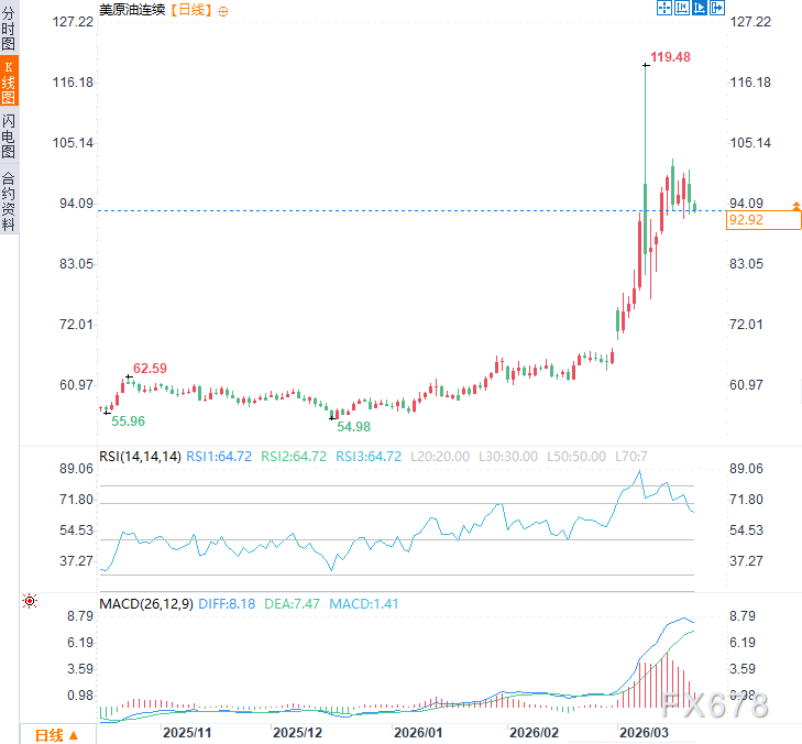 周五亚市时段,美原油价格震荡下行,现交投于每桶93.15美元附近,日内跌幅约2.5%,仍显著高于冲突爆发前水平。