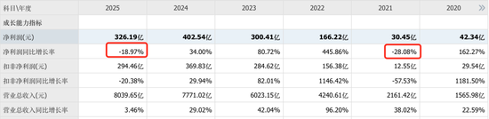 然而,当目光从“面子”转向“里子”,却发现了一个略显尴尬的现实:归母净利润仅为326.19亿元,同比大跌18.97%。